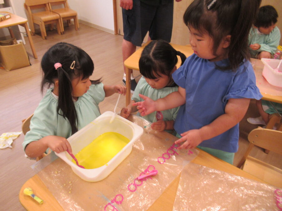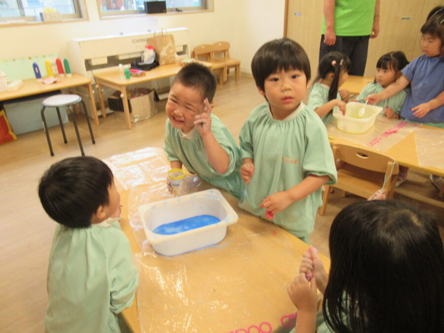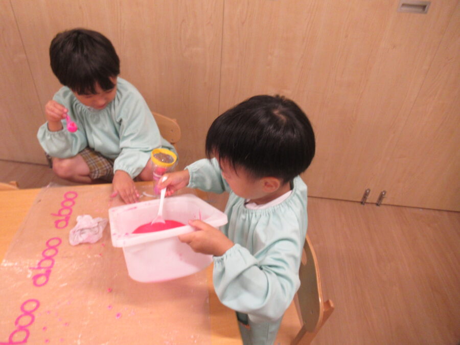 不思議な粉と色水を混ぜて、粘土遊びをしました。触ってみたら不思議な感触☺