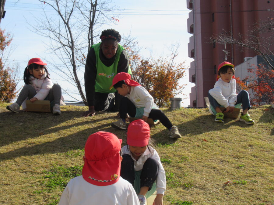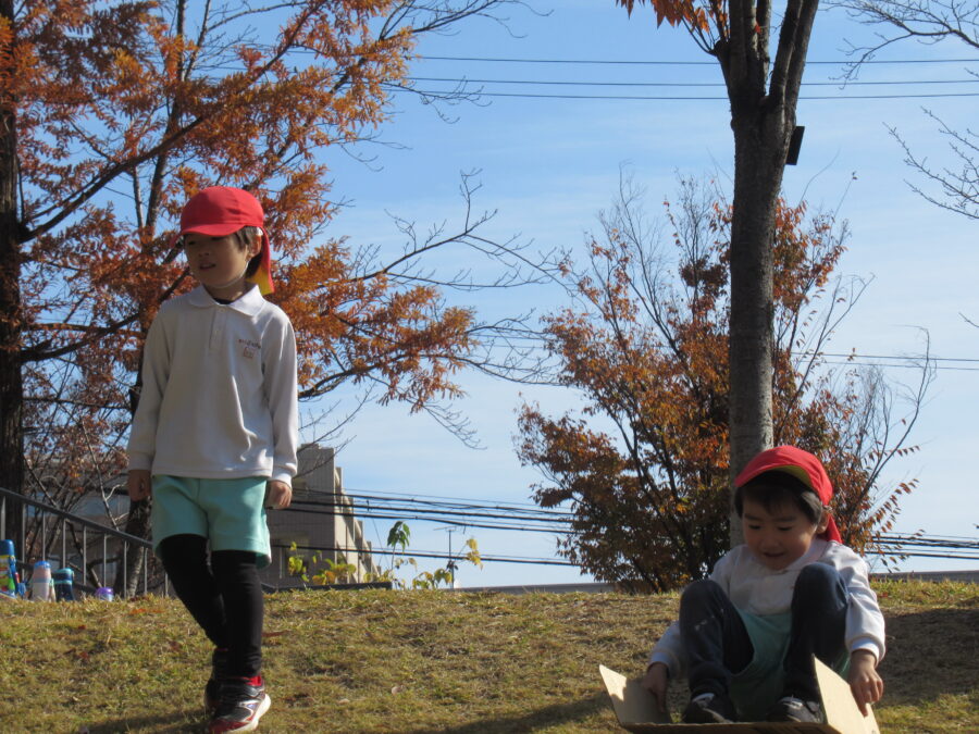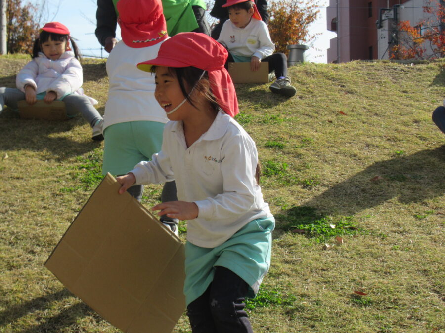 段ボールの切れはしを使って芝生滑りを楽しみました♬