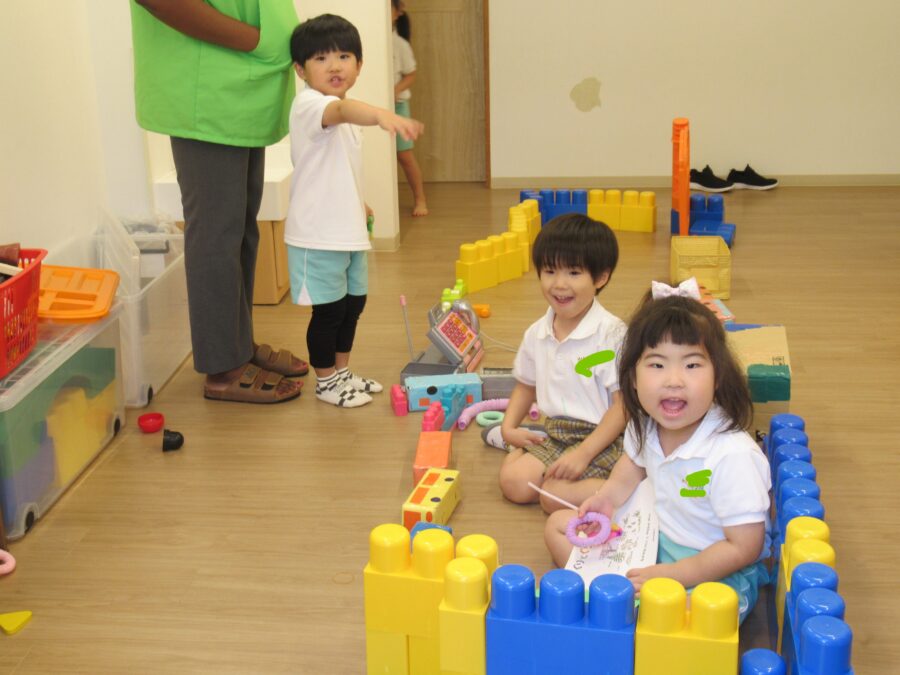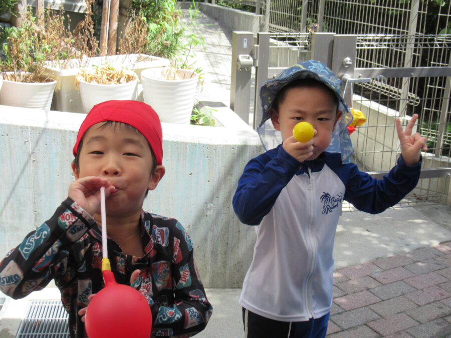 今日は、外でストローに風船をくっつけてふくらましたり…