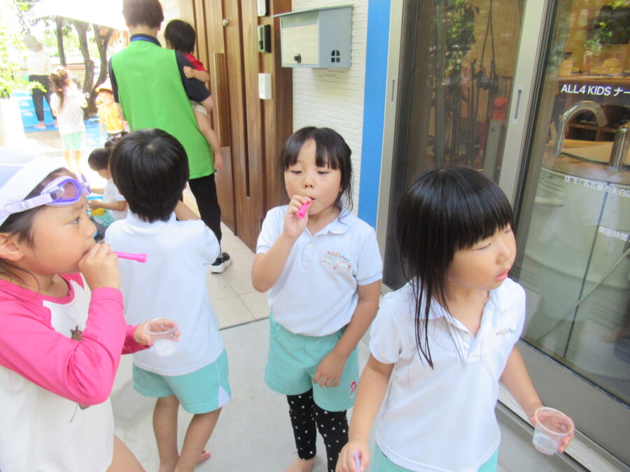 今日は、🐘さんと🦁さんでプールに入りました♪プールに参加しないお友達は、人気のしゃぼん玉遊びや、凍らせた色水でいい気持ち(^^♪