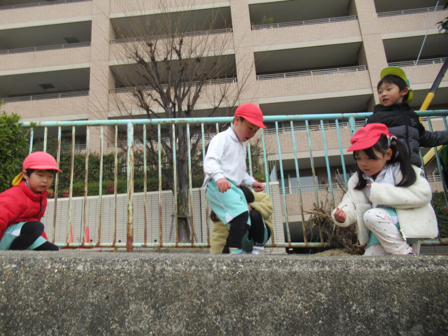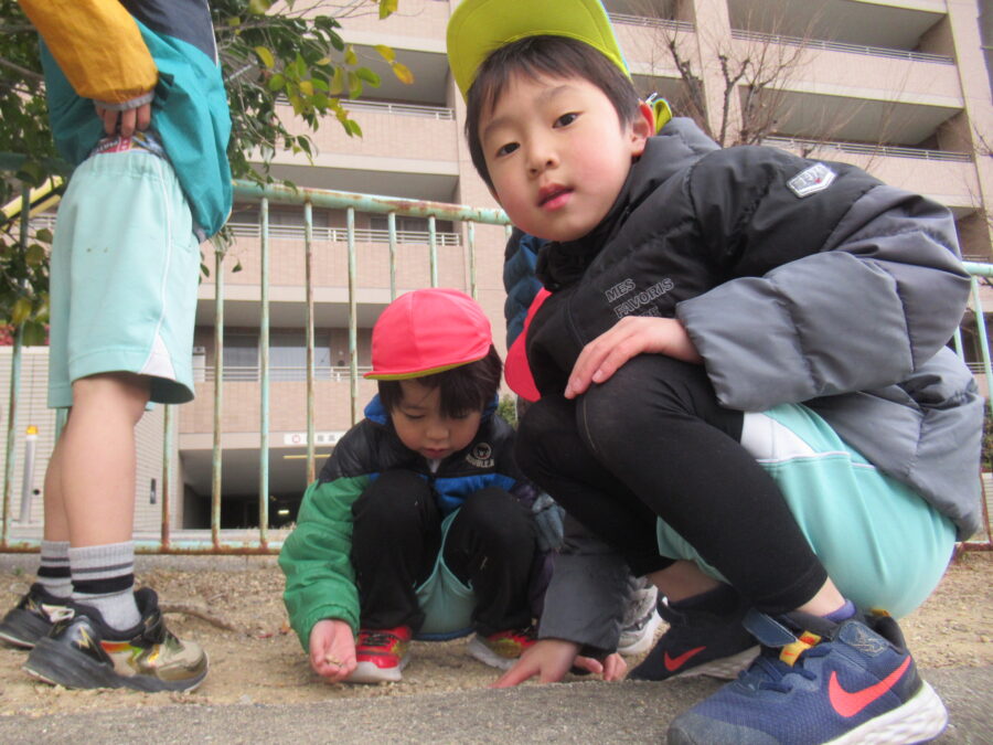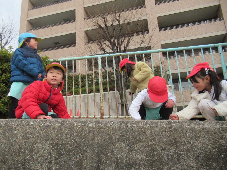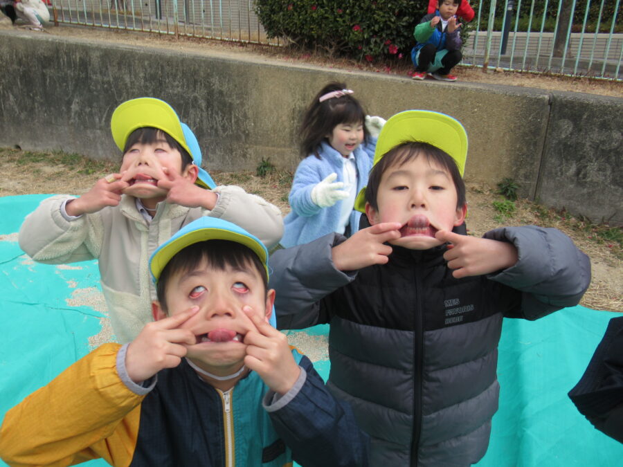 今日は、寒かった1日でした。みんなで変顔可愛かったね♡ クモがいる😲と発見したり、  お花を見つけたり・・・、寒かったけど、今日も元気でした。