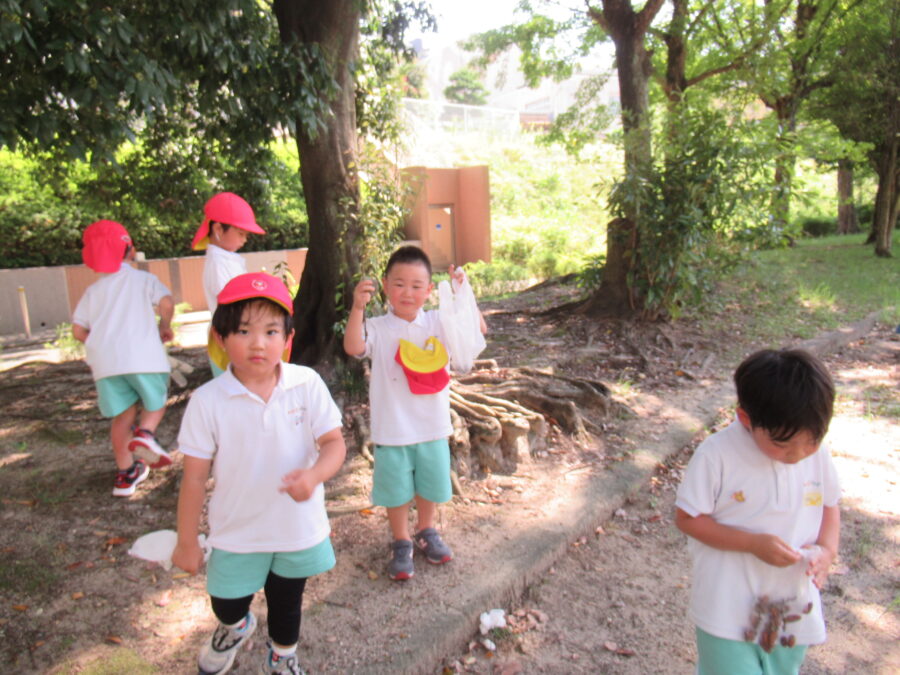 今日は、2クラスで公園に行きました。ドングリを拾ったり…
