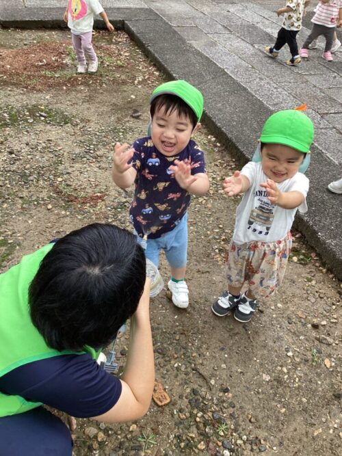 お寺についてからは、日差しが強かったので日陰に座る子、霧吹きの水がかかると「キャハハー」と笑顔が見られました♪
