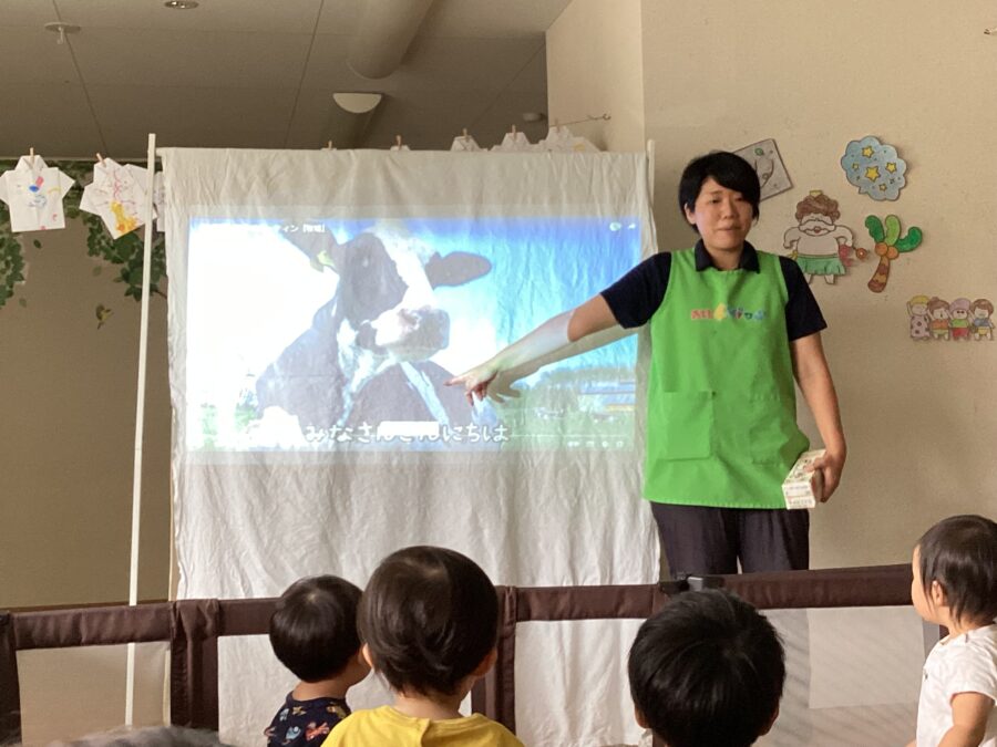牛さんの1日をみながら「うしさんごはん食べてるね〜」「ケンカしてるね〜」とみんなお話ししながらも興味津々な様子で見ていました💕