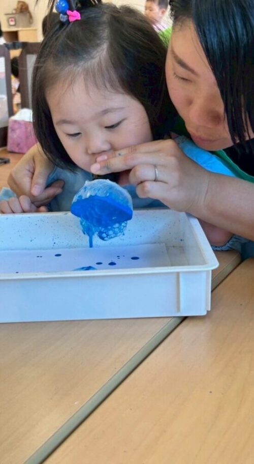 青色の絵の具をつけて フーーー