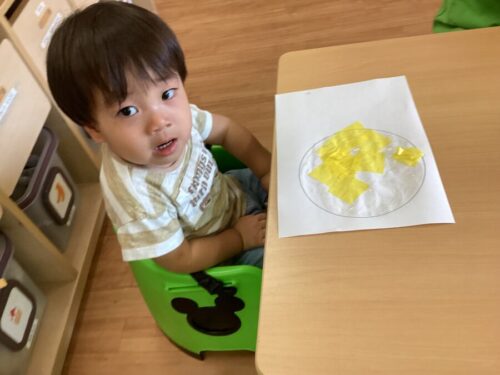 黄色い花紙を一枚づつペタペタはってお月さまを作ります(о´∀`о)