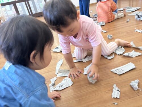 新聞をくるくる丸めてボールを作っていましたよ♪♪