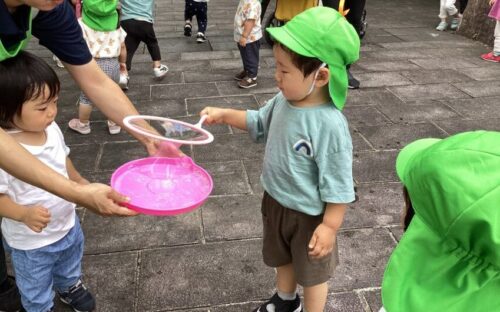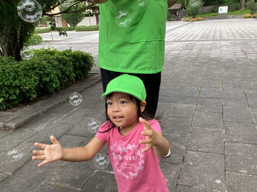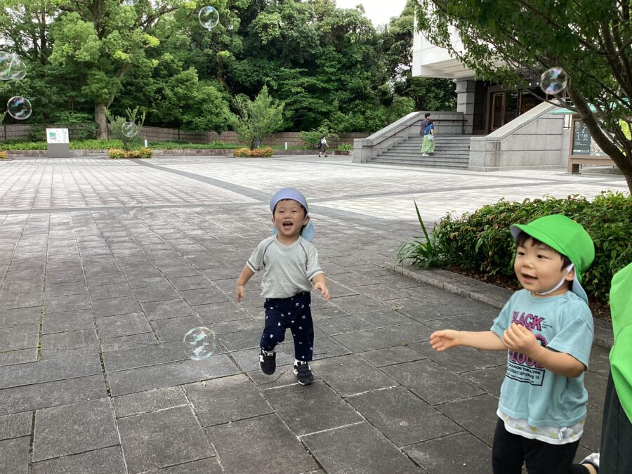 遠くに飛んでいくシャボンを全力で追いかける姿が見られましたよ♪