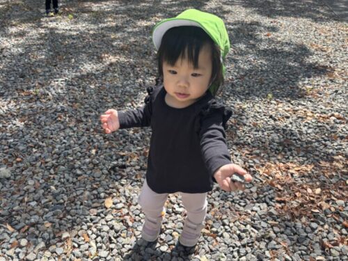 走ったり、小石や松の枝を拾ったり、「どーぞ♩」とお友だちにプレゼントをしてくれる姿も♪