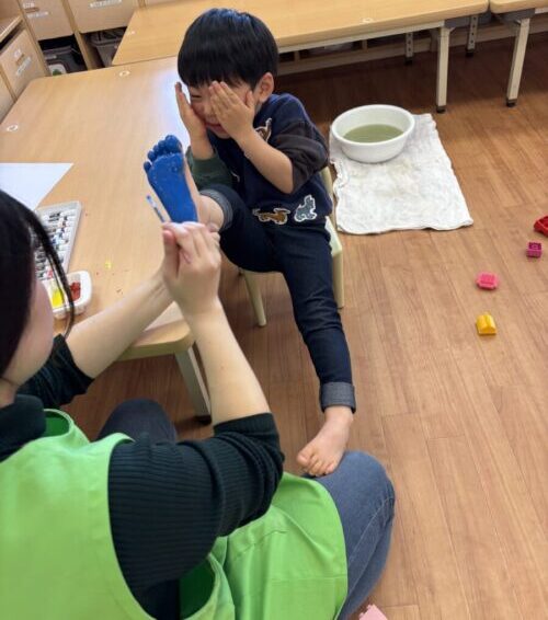 プレゼントの柄の一部になる足型、手型をとりましたよ