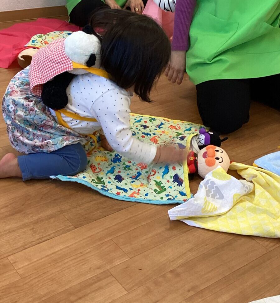 お布団の上にのせてトントンと寝かしつけをしたり、抱っこしたりとお世話をする姿が見られましたよ♪