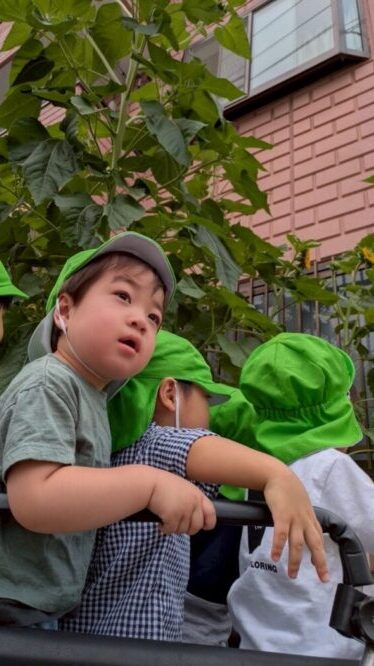 子どもたちはひまわりを見上げて