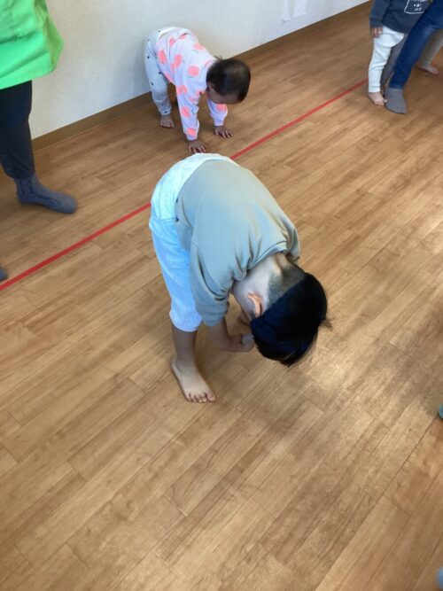 身体を前に屈伸です
