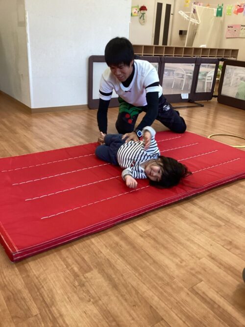 マットの上をコロコロ〜手を上に上げて転がります!