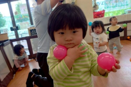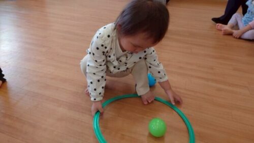 みんな好きな色のボールをたくさん持ってフープを探して歩き回りますっ