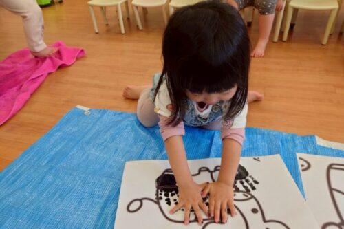 黒い絵の具を手につけて牛の絵柄にペタッ!