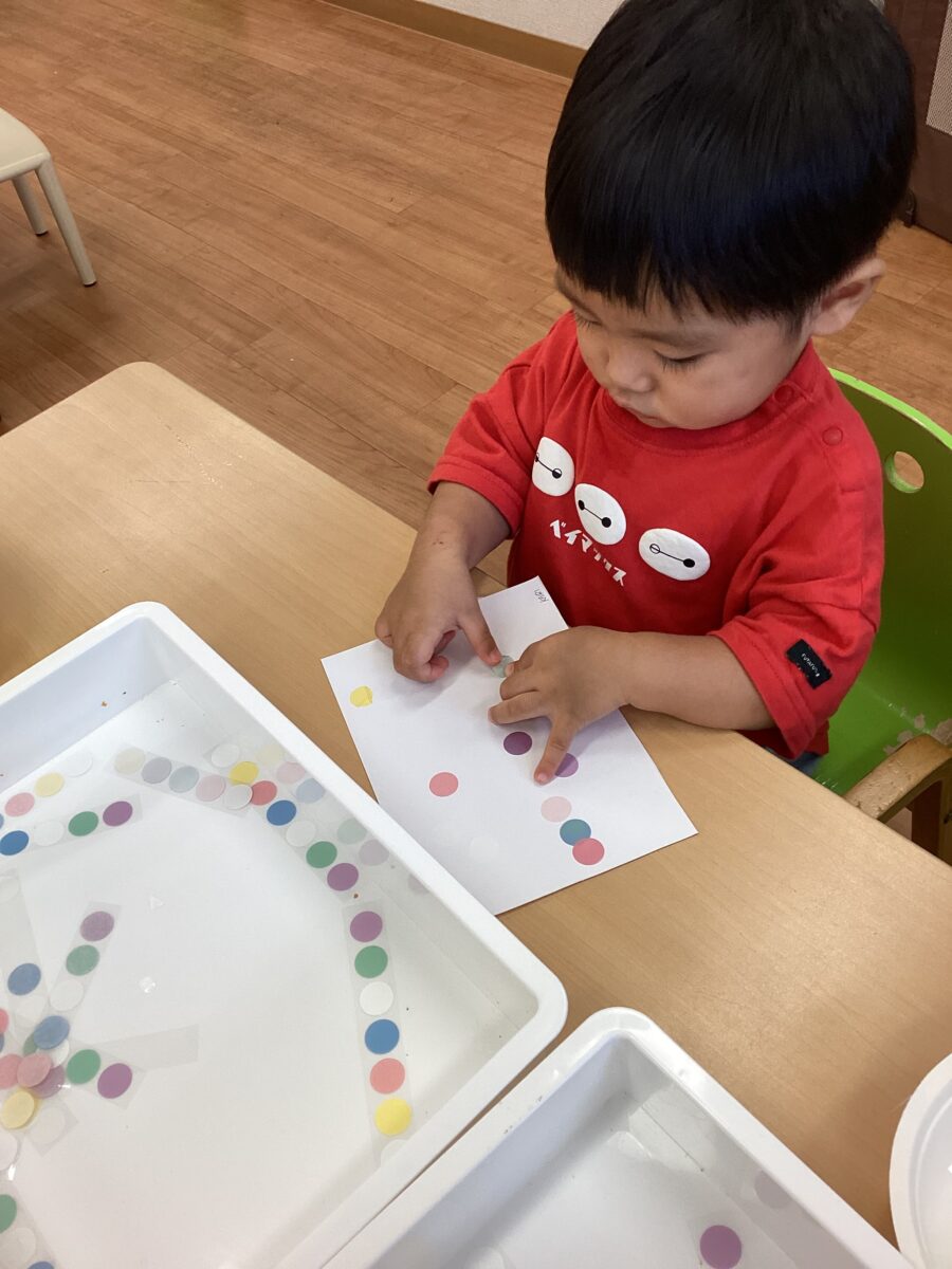 指先を上手に使いシールを剥がし、紙にペタペタとたくさん貼ってましたよ!
