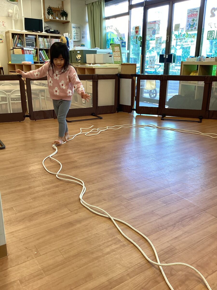 まずは、縄の上を歩きます!