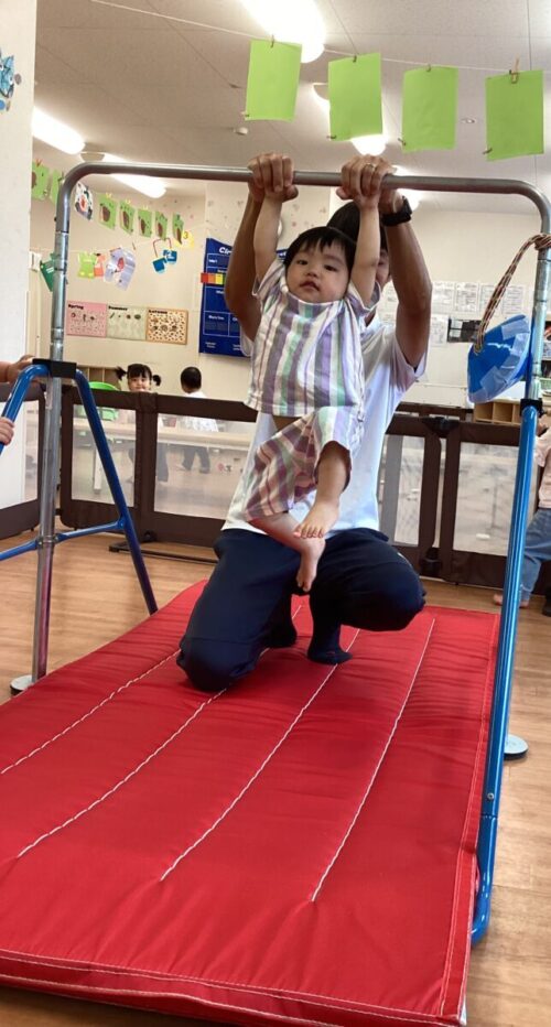 うさぎ組さんは先生に支えてもらいながらジャンプでタッチ!!