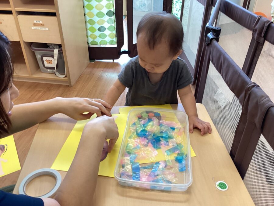 弾き絵をしたのですが、氷を使って色をつけたりと、夏らしい制作に子どもたちは大喜び!