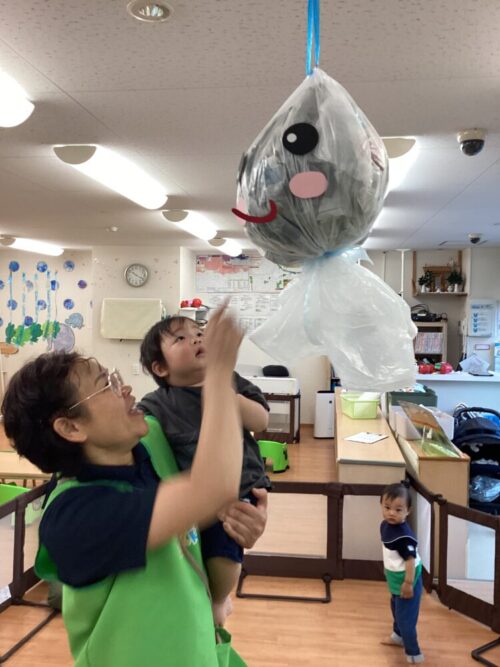 てるてる坊主に当たるかな〜〜と、エイッと投げる子や