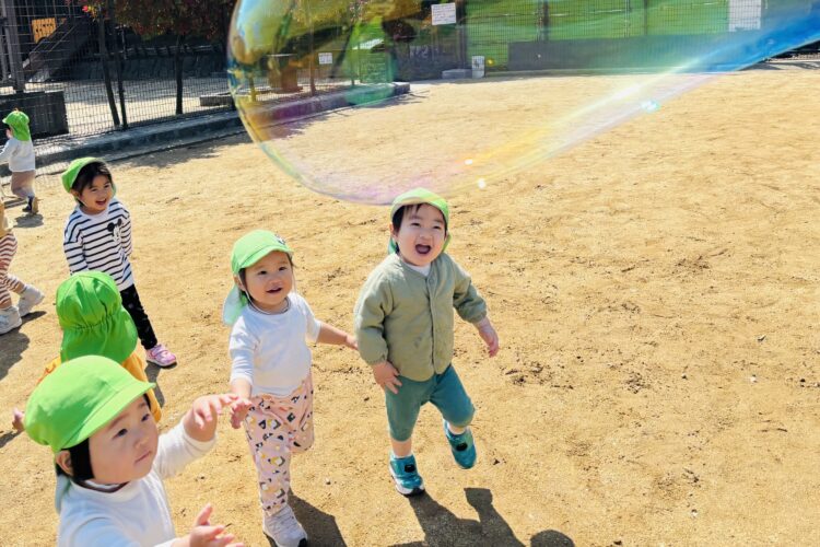 自分の体よりも大きなシャボン玉を追いかけ楽しむ姿がありました〜🎵
