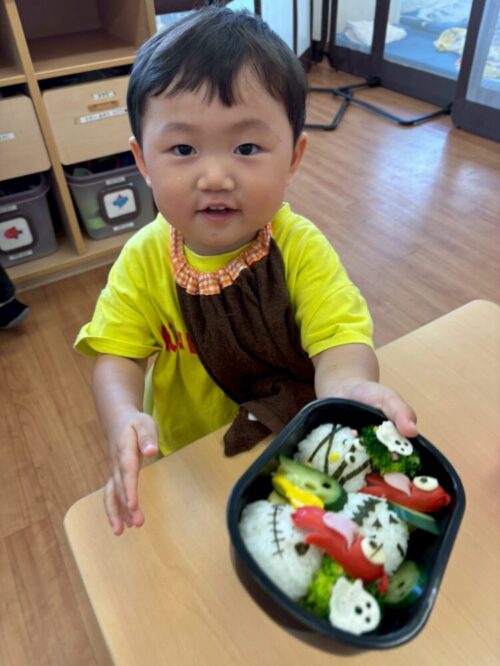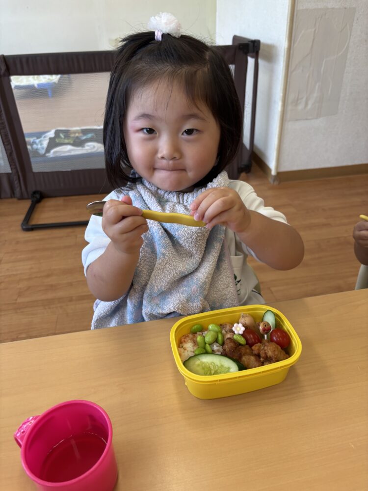 お弁当を手に登園してきて嬉しそうに見せてくてるみんな!