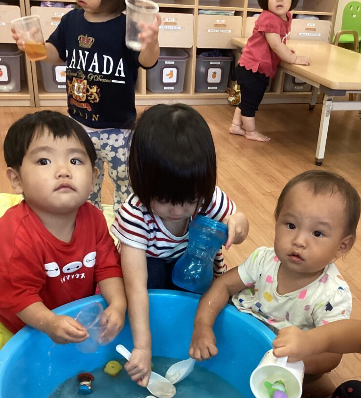 水の感触を楽しむ子どもたち♡ほっぺにペタっとつけて『気持ちいいね♪』