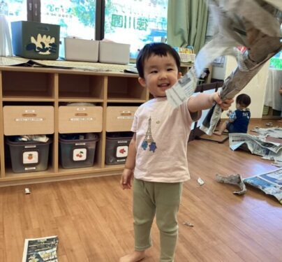 新聞紙をビリビリと破ったり、丸めるなど指先を使い楽しみました。