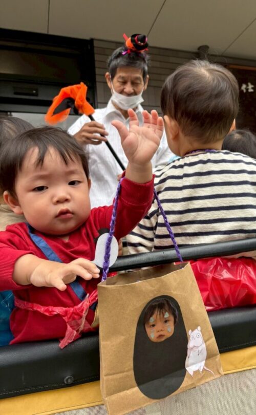 みんなが持っていったバッグの中に順番におかしを入れてもらって