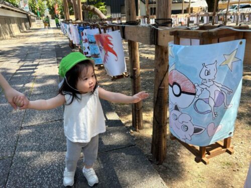 どこかの子どもたちが描いたであろう絵でできた提灯はかわいくて、子どもたちも興味を示して見ていましたよ‼️