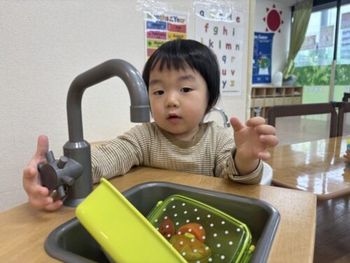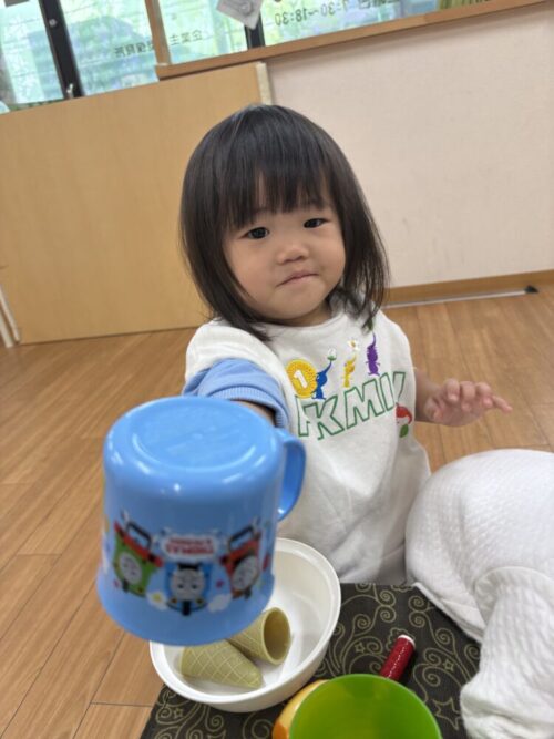 さて、今日は久しぶりに雨が降ったのでお部屋でおままごとをして遊びましたよ!