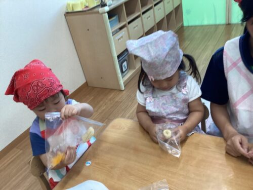 ジップロックの中にバナナと黄桃を入れてモミモミ〜