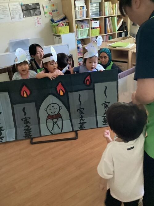 ぶどう組さんがおばけ役となり、もも、みかん組さんを脅かします。
