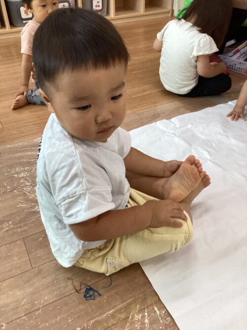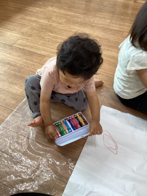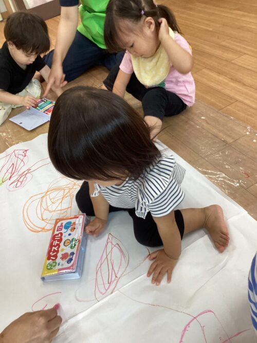 今日は床一面に模造紙を貼り付けてみんなでお絵かきをしました♪