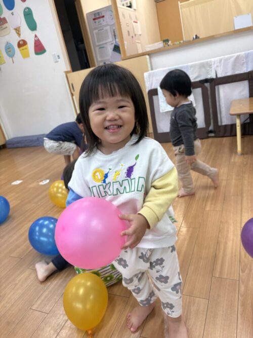 風船遊びでは、頭に風船が当たるとニコニコ笑って楽しそうにしたり、先生の真似をして結んであるところを伸ばして上手に飛ばすことができていました!