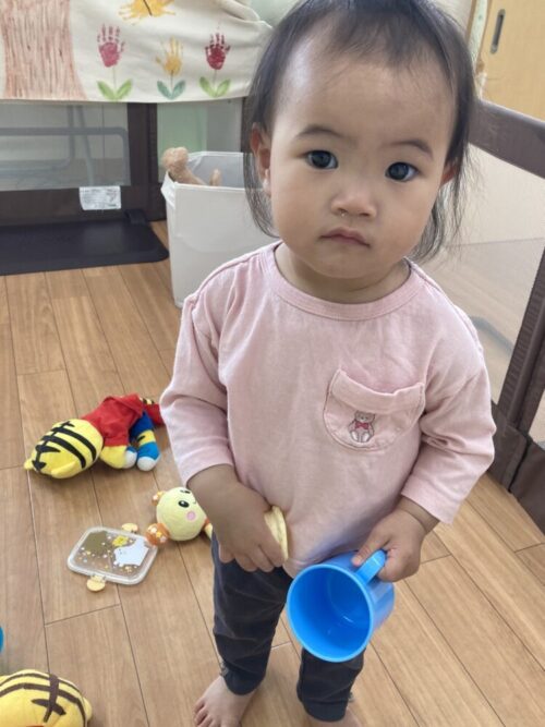 コップで飲み物を飲む真似をしたり、お気に入りのぬいぐるみも見つけていましたよ😉