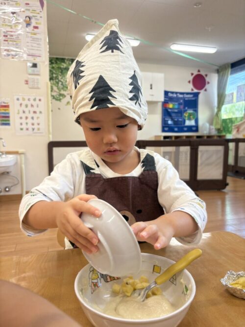 今日は、ぶどう組さんはクッキングでさつまいも蒸しパンを作りましたよ〜!