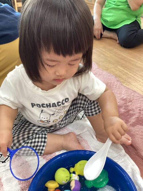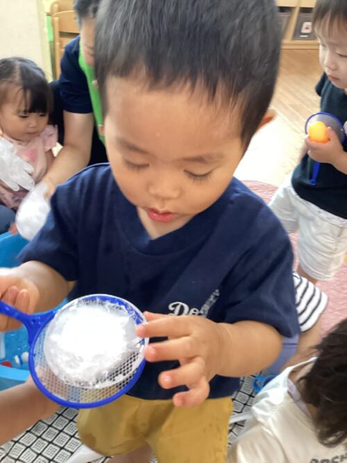 氷で冷たさを感じたり、おもちゃをポイやレンゲですくったりして楽しんでいた子どもたち☺️