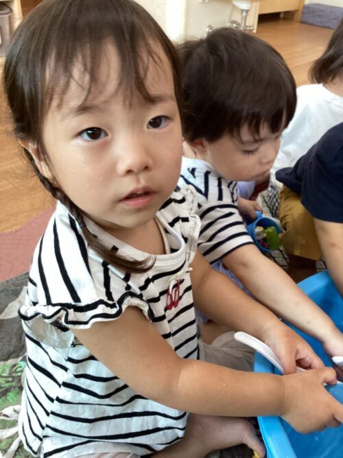 子どもたちはタライで水遊びをしました!