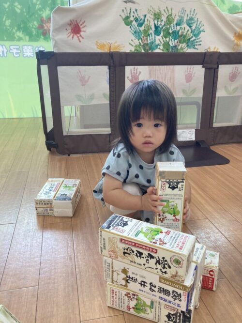 もも組さんは牛乳パックの積み木で遊びました!