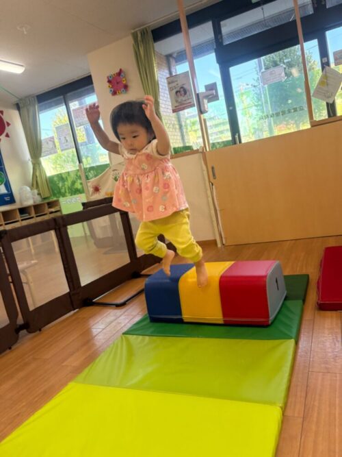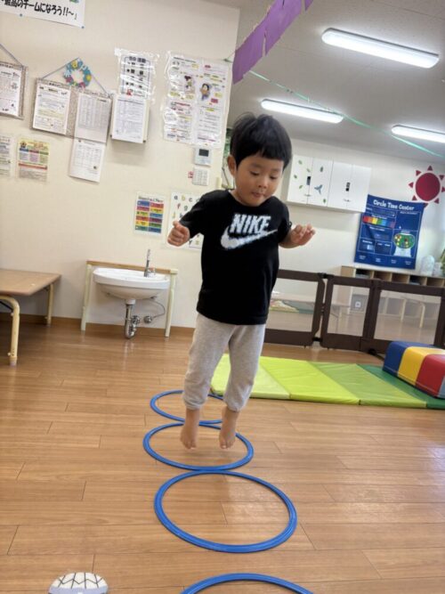でんぐり返し→跳び箱からのジャンプ→フープのところをジャンプのサーキットをして体を動かしました❗️