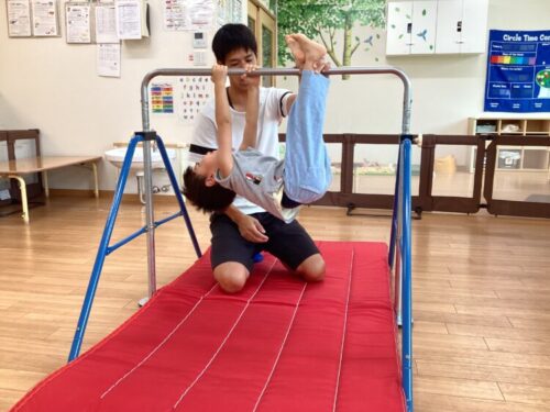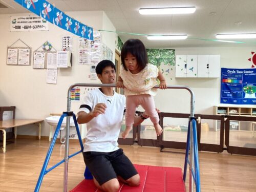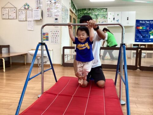 もも組さんは手を離してしまうお友だちが多かったですが、体操の先生の支えもあってできました‼️