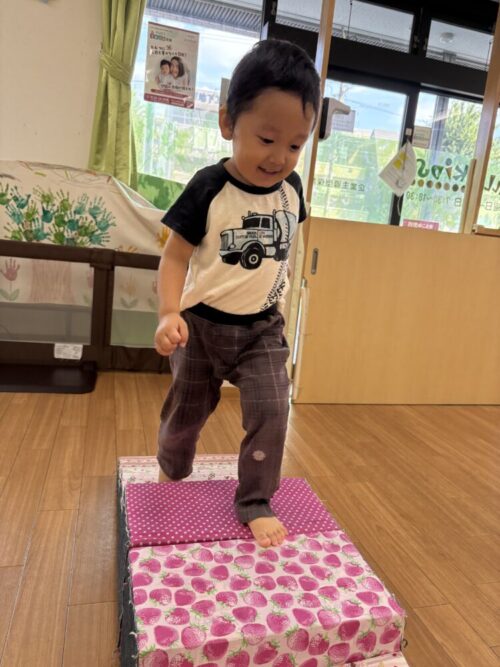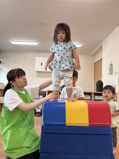 跳び箱にはぶどう組さんは自分の力でよじ登って、1人でジャンプができます✨