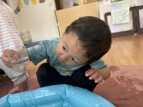 今日はお部屋の中で今年初の水遊びをしましたよー!