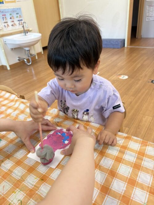 今日は、昨日の制作の続きをしたり洗濯バサミのおもちゃで遊んだりしましたよ!