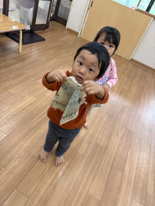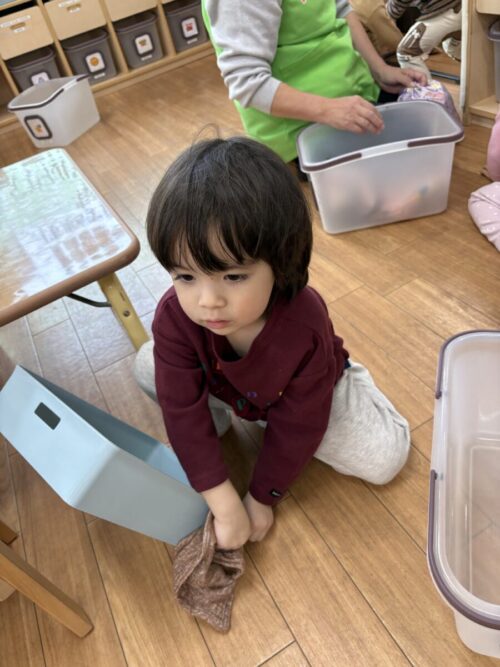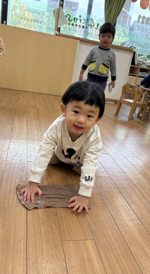 両手で雑巾をもって上手に拭くことができていました✨