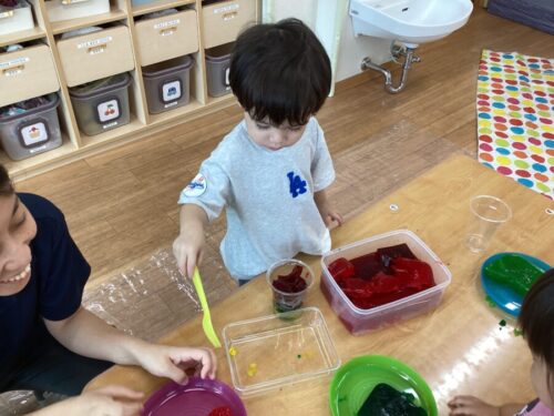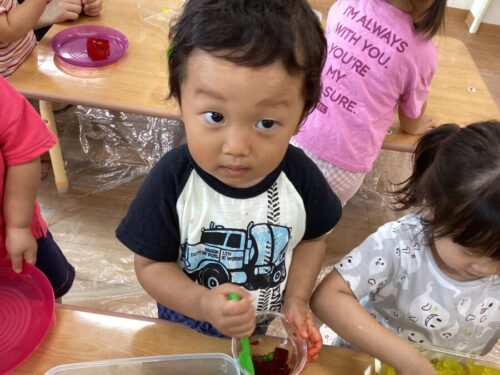 最初から、寒天の感触を楽しむお友だちや、最初は嫌がっていたけど触れるようになってグチャグチャにして遊ぶお友だち、全く触らないお友だちとみんなそれぞれでした💦