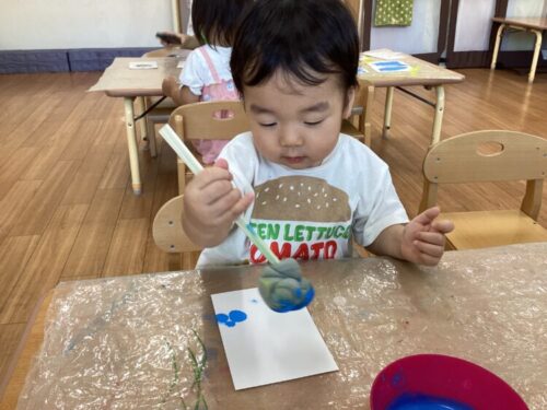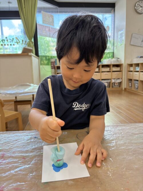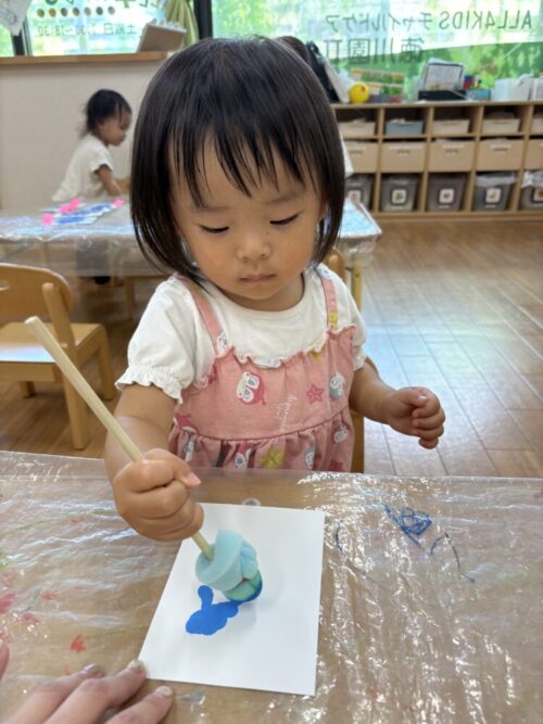 今日は水色の絵の具を使ってスタンプをしました!