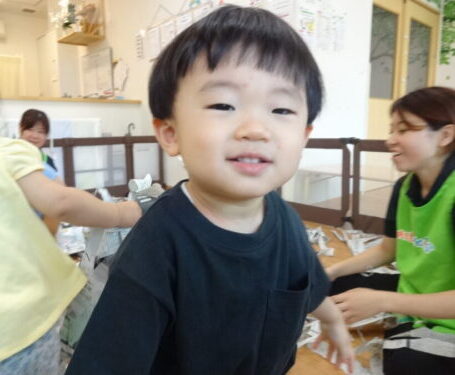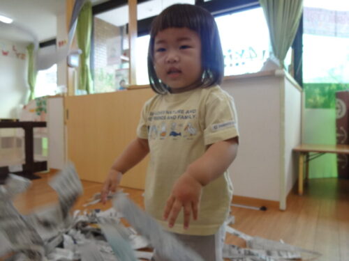 やぶいた紙がたくさんあったので、たくさん拾ってお友だちや先生にむかって
